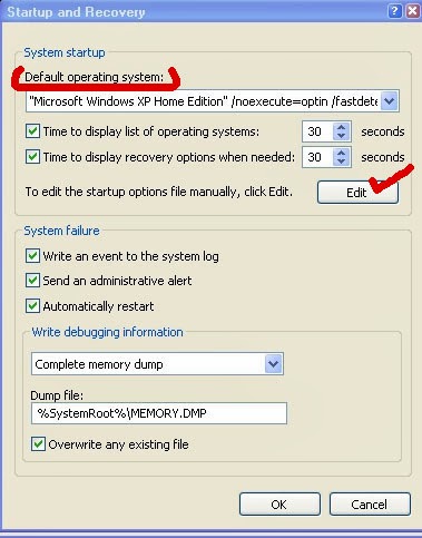 Pada bagian ‘default operating system’ pilih ‘edit’ setelah terbuka sebuah jendela munculan hapuslah pada baris bagian kedua atau seperti dalam gambar yang sengaja saya lingkari dengan warna merah. Dalam tahap ini saya sarankan untuk berhati-hati jangan sampai anda salah menghapus, karena jika kita salah menghapus baris perintah tersebut bisa menghilangkan windows yang aktif. Untuk lebih jelasnya klik pada gambar untuk memperjelas lagi.